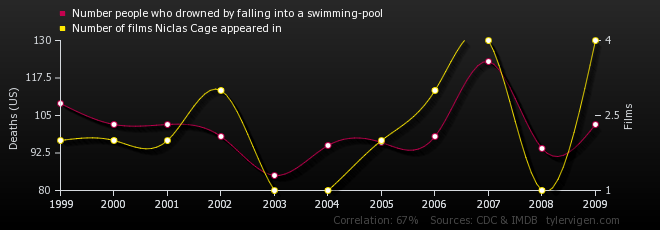 Spurious Correlations: Number people who drowned by falling into a swimming-pool correlates with Number of films Nicolas Cage appeared in Posted on February 9, 2015 by Mr. Lakhaney http://tylervigen.com/ Related