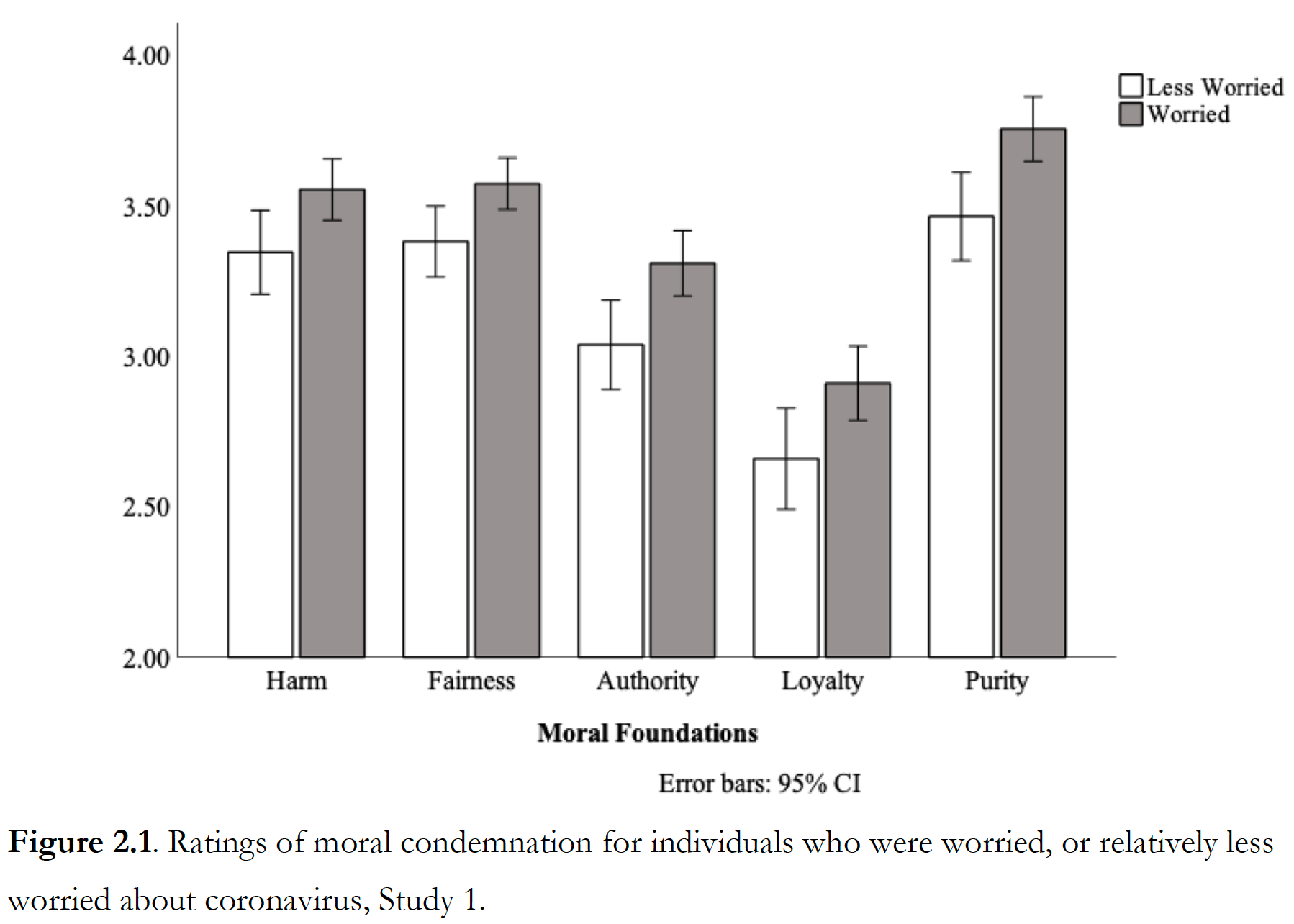 First, I found that people who were particularly worried about contracting COVID-19 in early 2020 also delivered harsher moral judgments for unrelated transgressions, relative to those who were less worried about contracting COVID-19. Results held after controlling for political orientation.