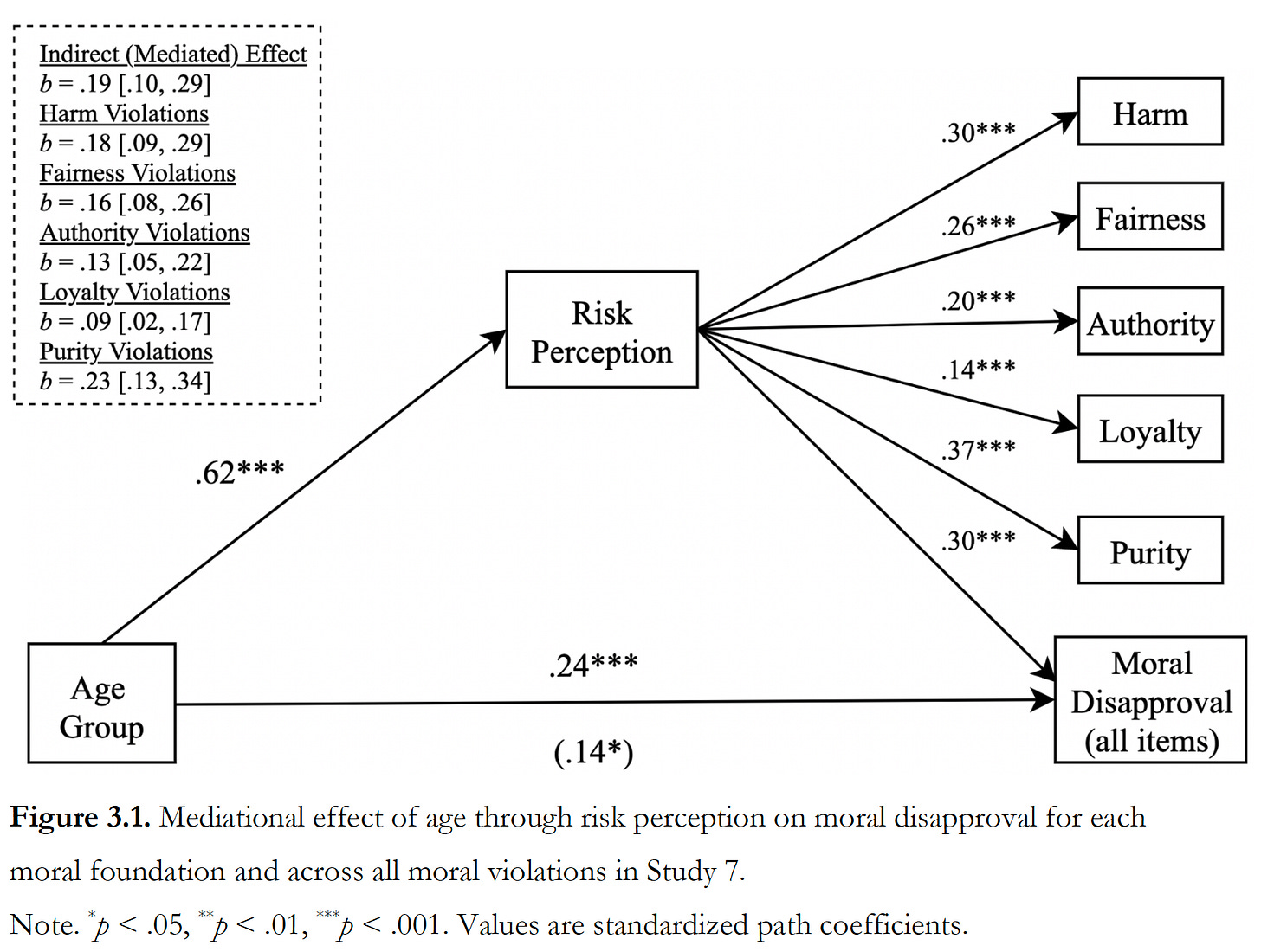 Second, I found that older adults delivered harsher moral judgments than younger adults, and that this was in part driven by risk aversion. Older people perceive more risk in their environment, and this appears to extend to moral wrongdoers. Results held after controlling for political orientation, education, and income.